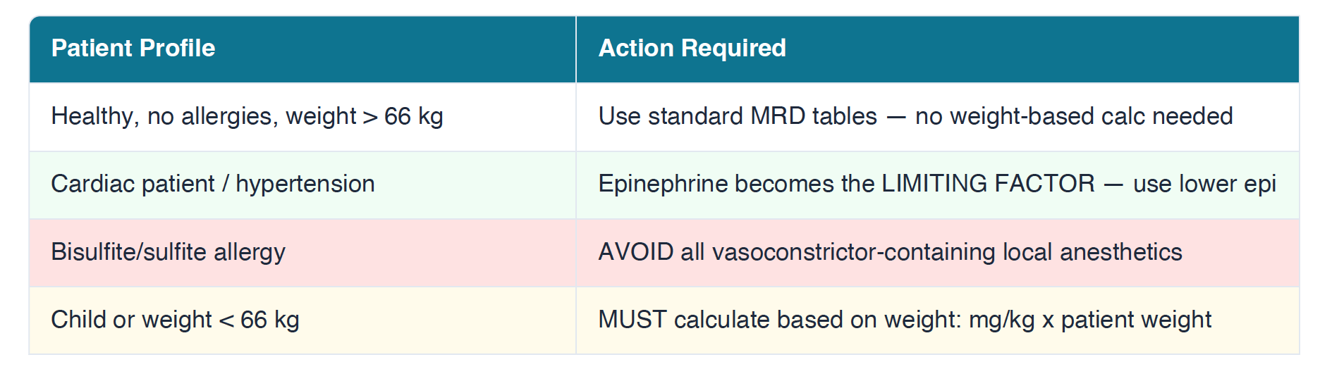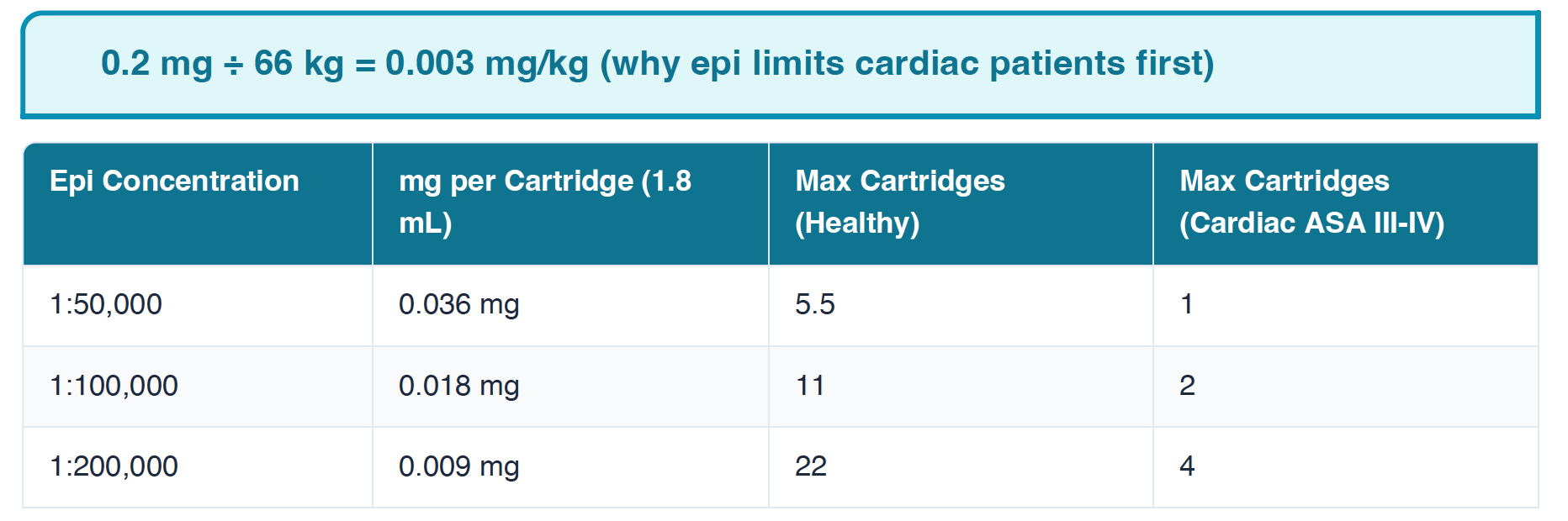 Not exactly. For cardiac patients (ASA III–IV), epinephrine becomes the limiting factor — not the local anesthetic. You cap epinephrine at 0.04 mg per appointment (vs 0.2 mg for healthy patients), which drastically reduces the number of cartridges allowed. Always check which factor — the LA or the vasoconstrictor — runs out first.